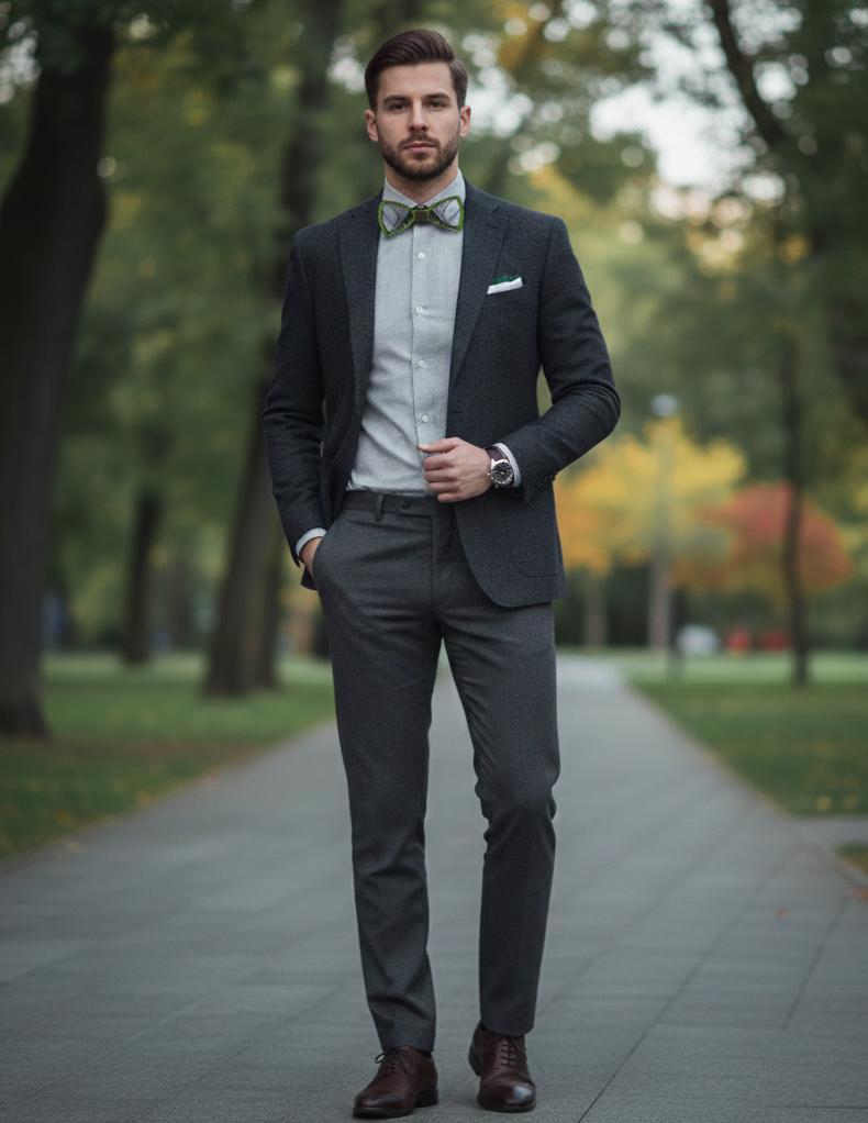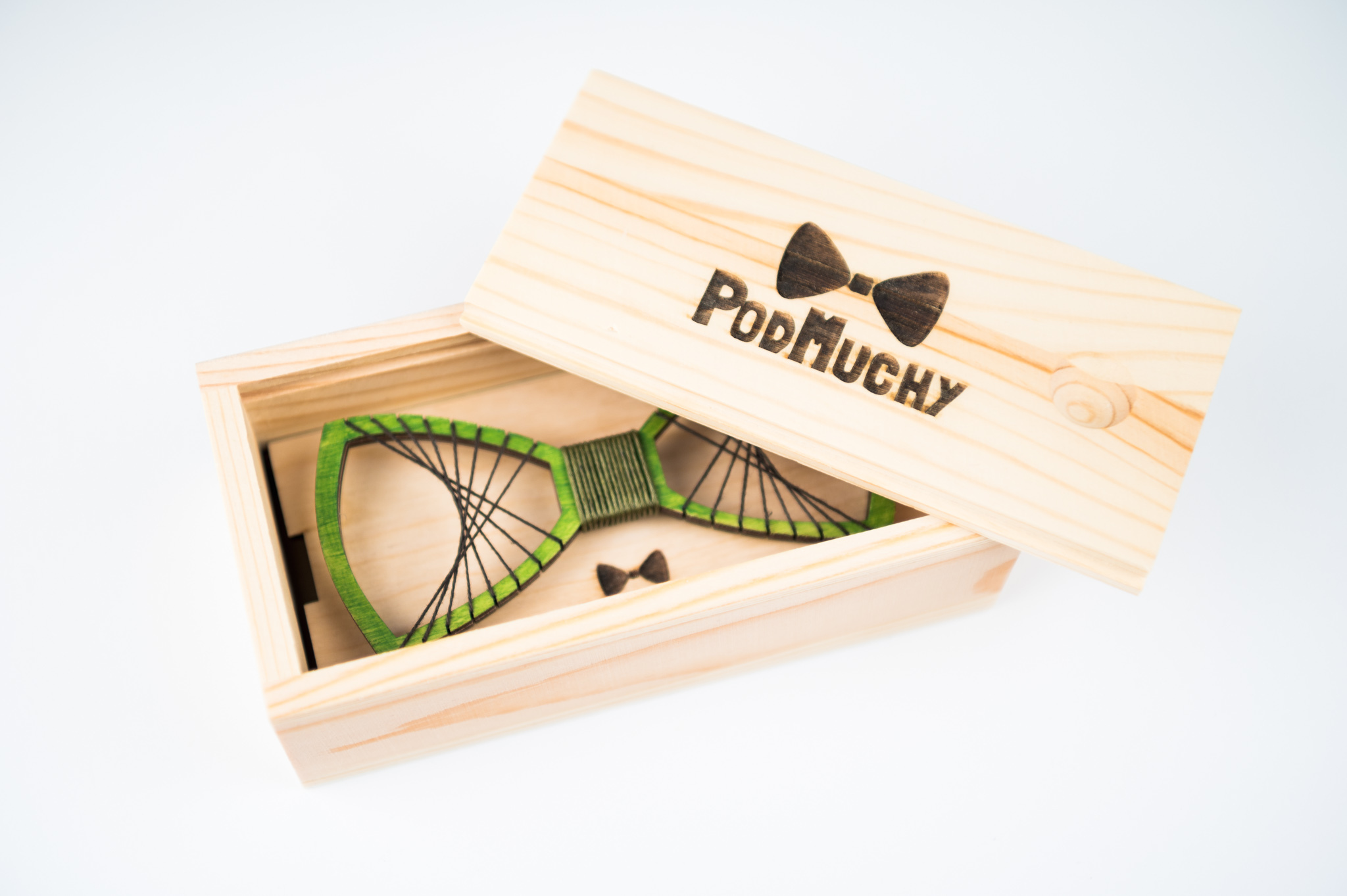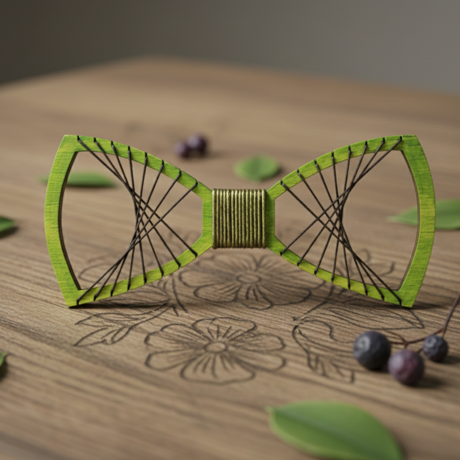 Centralny węzeł z zielonej nici dodaje spójności i podkreśla ekologiczny charakter produktu. Każda mucha powstaje w pracowni PodMuchy, gdzie tradycja spotyka się z nowoczesnym designem i emocjonalnym podejściem do mody męskiej. Drewniane pudełko dołączone do zestawu sprawia, że mucha idealnie nadaje się na prezent.