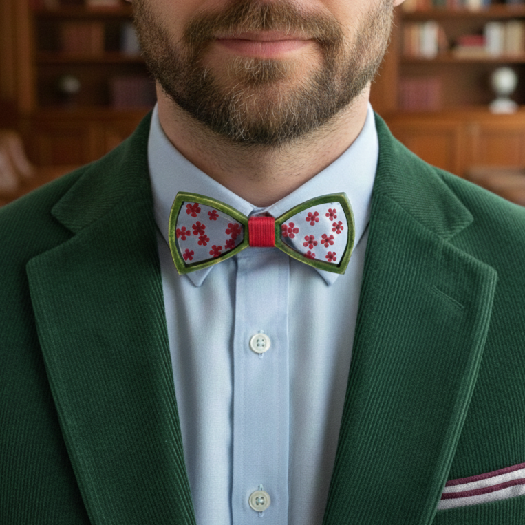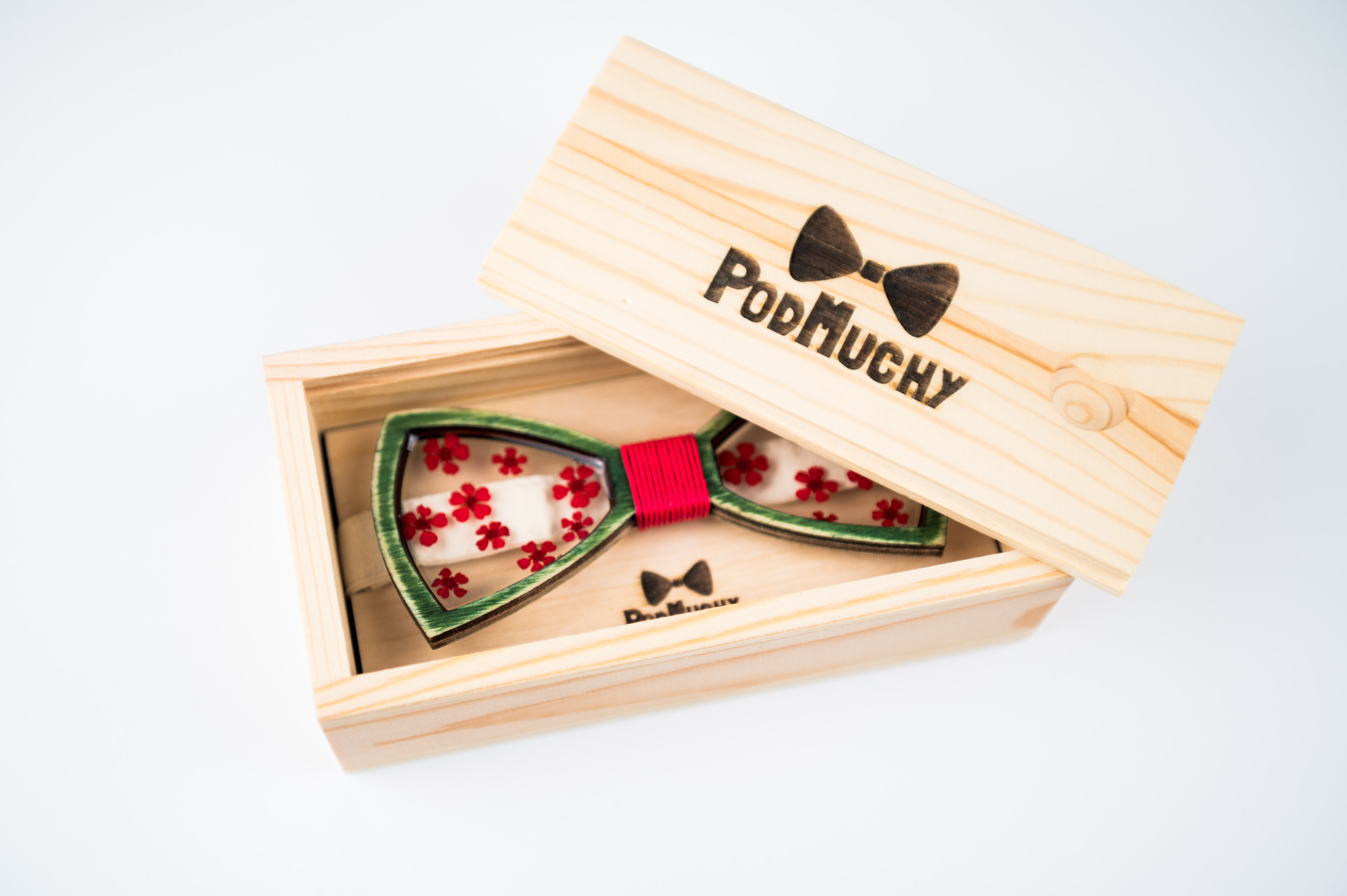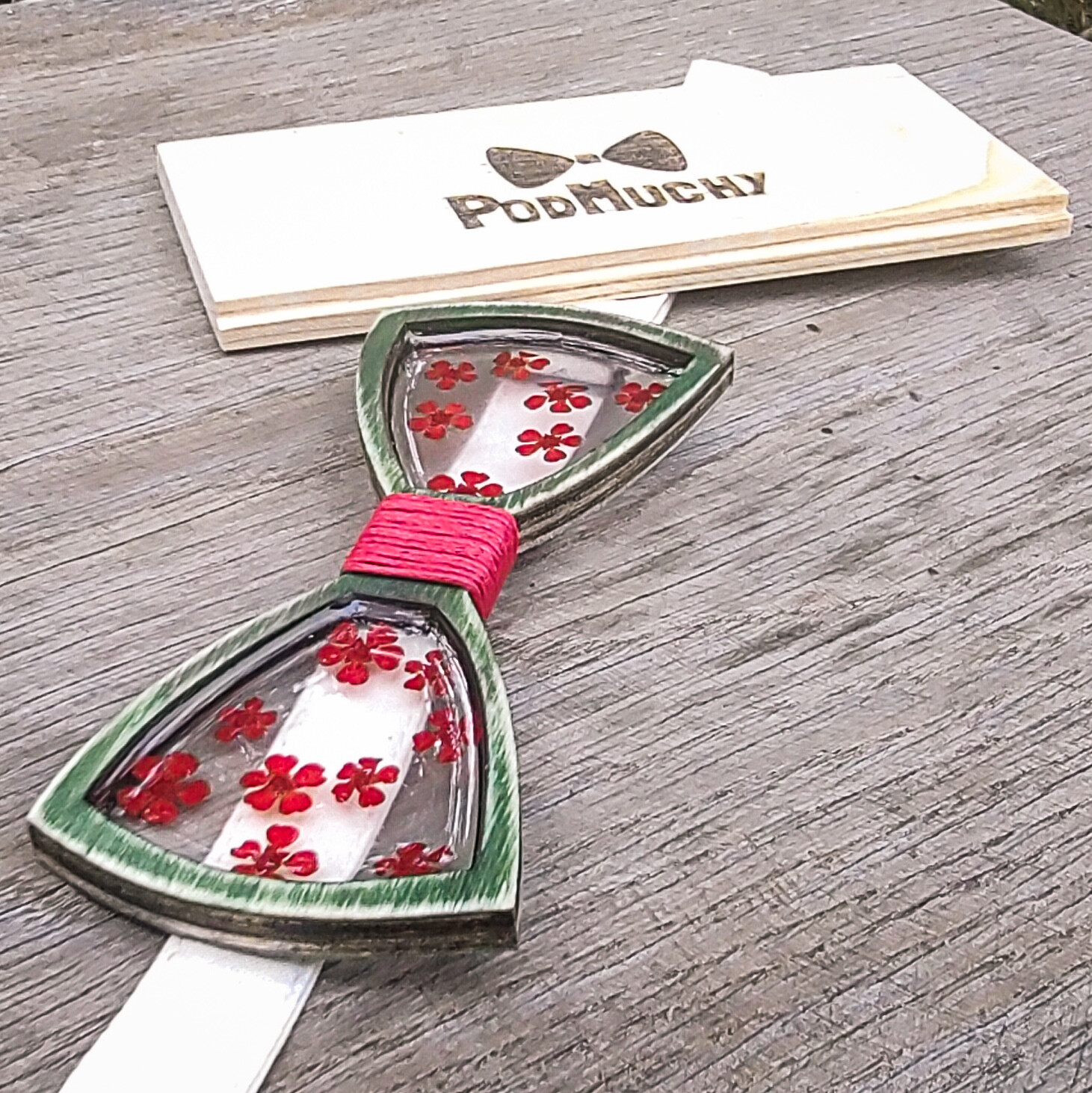 ZATOPIJKA to niezwykła, drewniana mucha, która łączy modę męską z naturą i sztuką. Jej zielona rama kryje zatopione czerwone kwiatuszki, tworząc kompozycję pełną życia i subtelnej elegancji. Centralny czerwony węzeł dodaje energii i kontrastu, podkreślając artystyczny charakter dodatku.