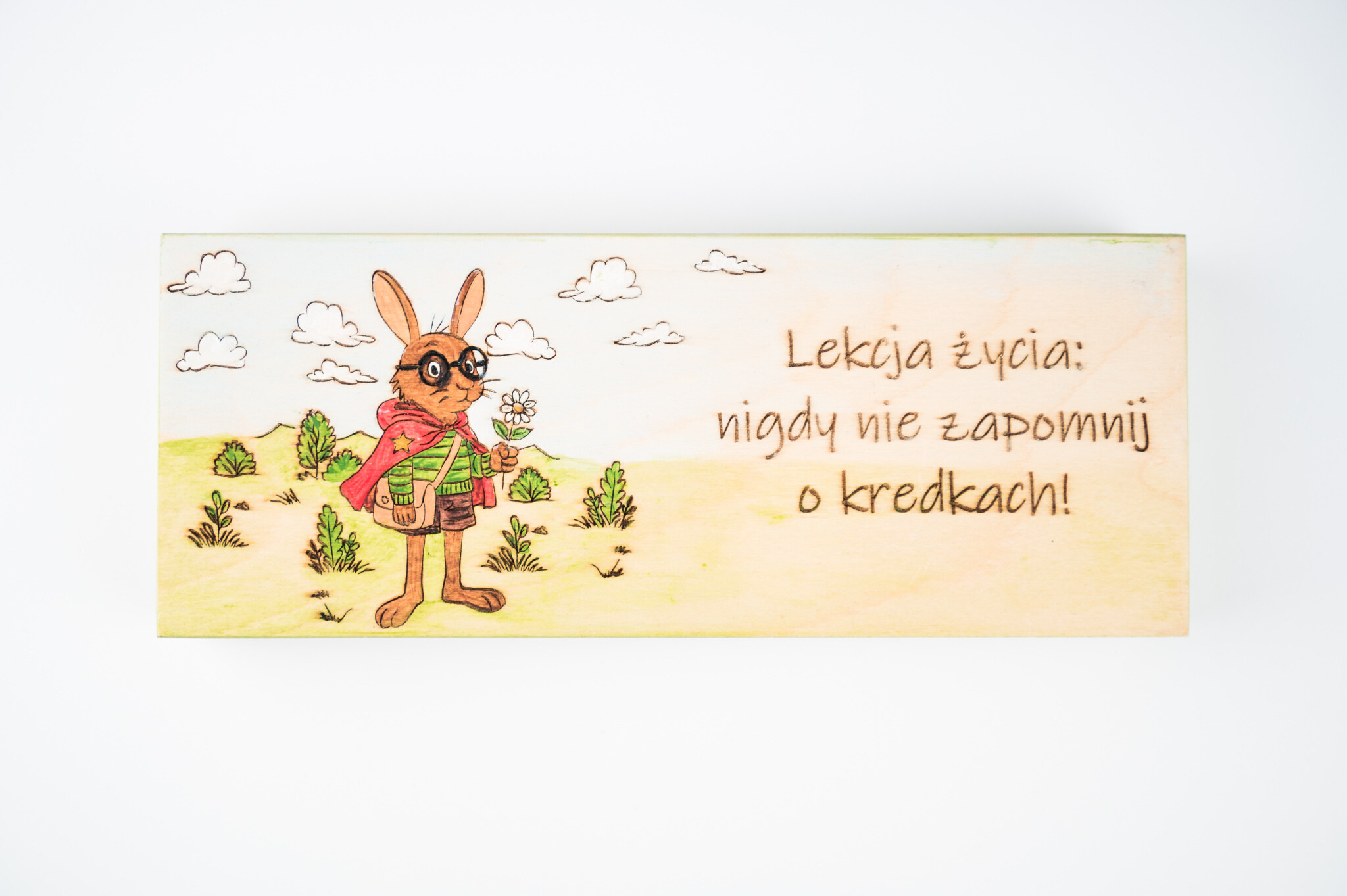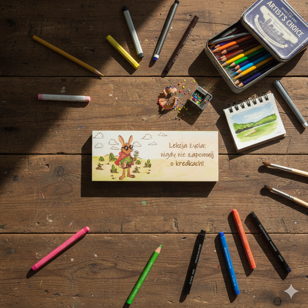 Bo wyobraźnia to najważniejszy przedmiot w szkole. Ten uroczy drewniany piórnik z zającem z ręcznie malowaną ilustracją króliczka to nie tylko praktyczny organizer na ołówki i drobiazgi, ale także codzienne przypomnienie, że kreatywność to klucz do pięknych wspomnień. Bajkowy króliczek w okularach, czerwonym szaliku i zielonej koszulce, trzymający kwiatek na tle chmurek i trawki, tworzy pogodny, edukacyjny klimat. Całość dopełnia napis: „Lekcja życia: nigdy nie zapomnij o kredkach!” – idealny dla dzieci, nauczycieli, przedszkolanek i wszystkich, którzy kochają rysować.